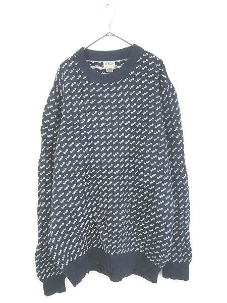 古着 Deadstock!! 00s LL Bean ネイビー×ホワイト×グレー バーズアイ ヘビー ウール ニット セーター XL-TallKnit-Sweater