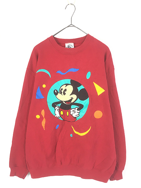 古着 90s USA製 Disney Mickey 青パン おすわり ミッキー 両面 BIG プリント スウェット トレーナー レッド LSweat