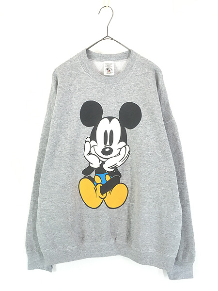 古着 90s USA製 Disney Mickey 青パン おすわり ミッキー 両面 BIG プリント スウェット トレーナー グレー XLSweat