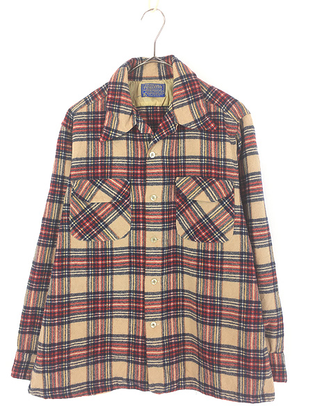 古着 70s USA製 Pendleton ベージュ タータン チェック 開襟 ボックス ウール ボード シャツ LShirts